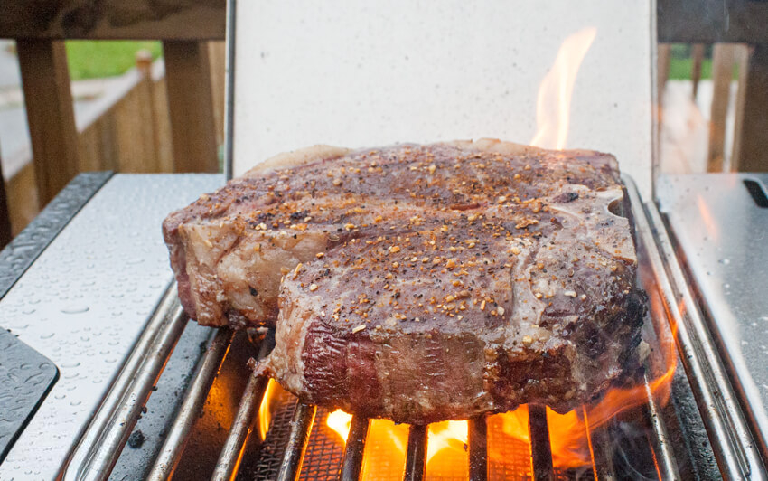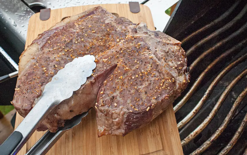 5. Coloque el filete T-bone sobre los quemadores apagados y cocínelo con calor indirecto hasta que el termómetro marque 55 °C. Retírelo y déjelo reposar sobre una tabla de cortar.