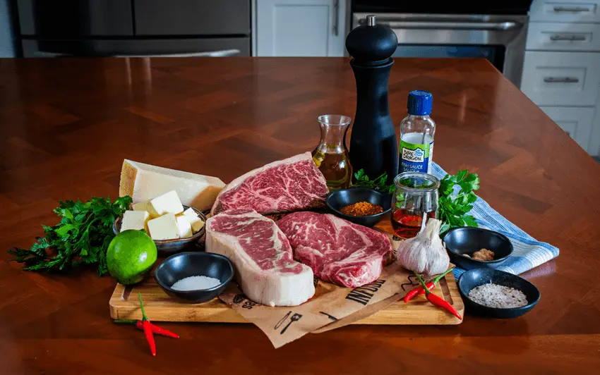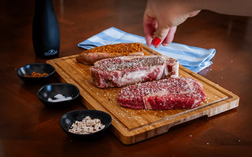 1. Sazona los filetes al gusto. Usa el condimento BBQ brasileño para la Picanha, sal y pimienta para el NY Strip, y añade ajo deshidratado para el Porterhouse. Deja reposar los filetes al menos 40 minutos sobre una rejilla para que se curen en seco mientras preparas las mantequillas y el chimichurri.